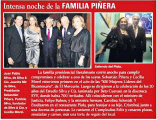 "...Y finalizaron en el restaurante Piola, para festejar a su hijo Cristóbal junto a una decena de personas. Le cantaron el Cumpleaños Feliz y cenaron pizzas, ensaladas y carnes, más una torta de regalo del local". La Segunda